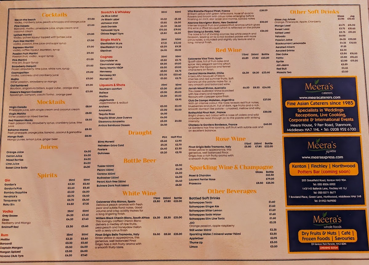 Welcome to Meera's Bar & Restaurant, where authentic Indian vegetarian cuisine meets a delightful dining experience. Nestled in the heart of Edgware, this charming venue offers a variety of innovative dishes that cater to diverse palates, from hearty Aloo Sagwala to flavorful Hakka Noodles.